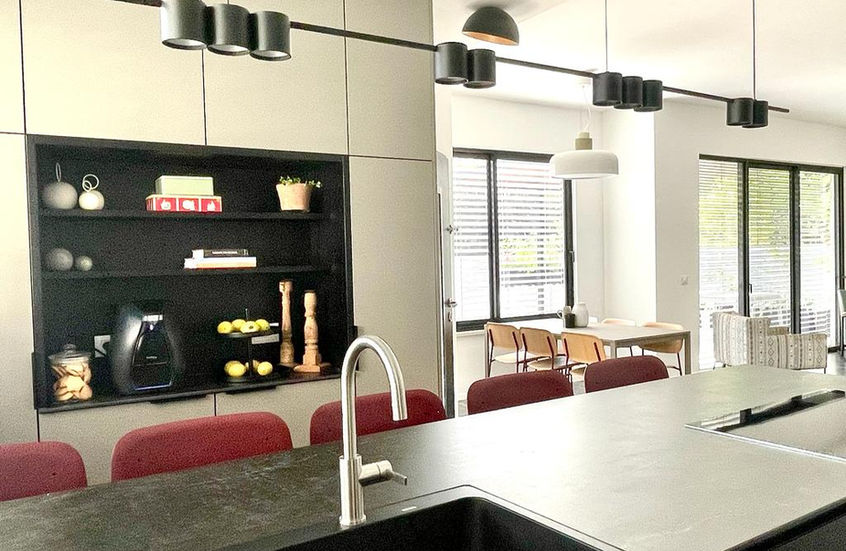 הארונות התוחמים חולקו ע"פ נוחות העבודה במטבח- הצד "התפעולי" ובו שולבו המקרר והתנור ובצד איזור הישיבה, יצרנו פינת קפה.
